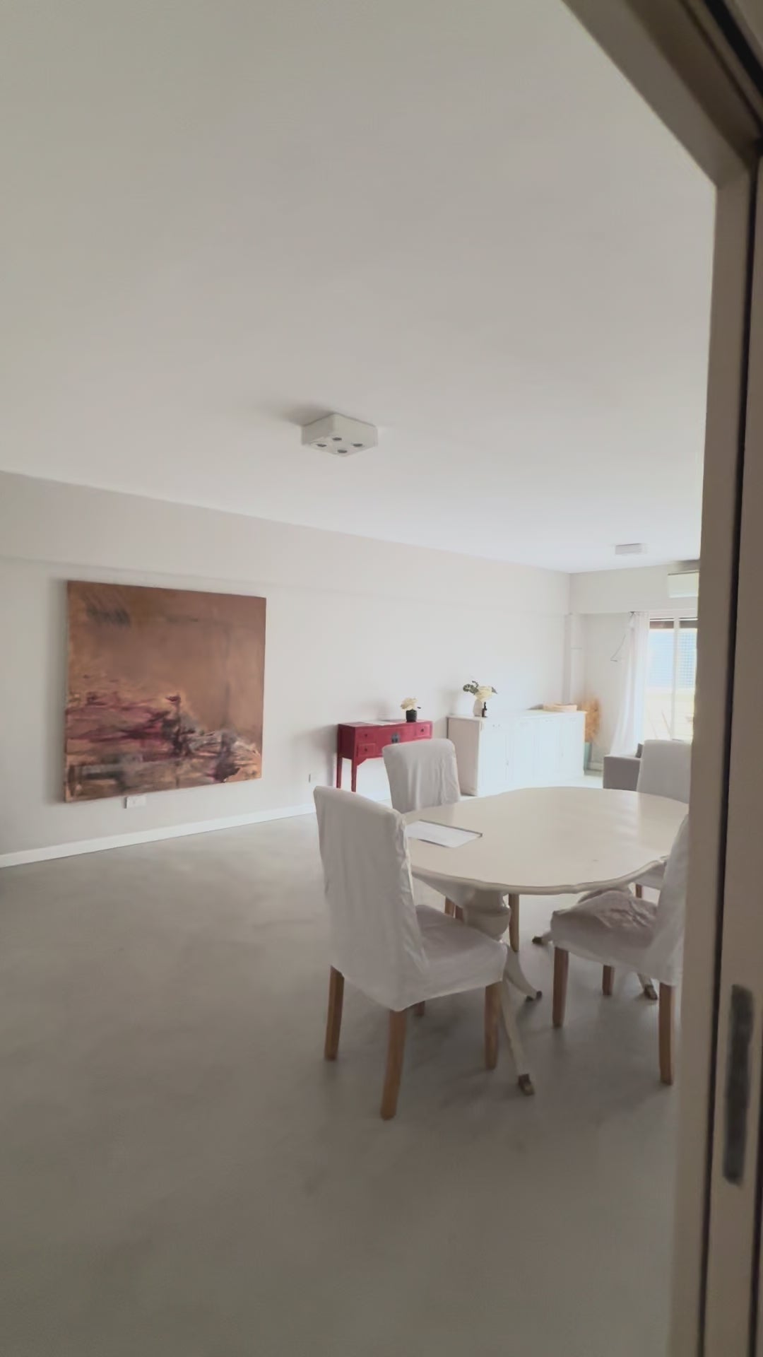 The apartment features a large and luminous living room with plenty of natural light, a comfortable sofa, Smart TV, and access to the balcony.